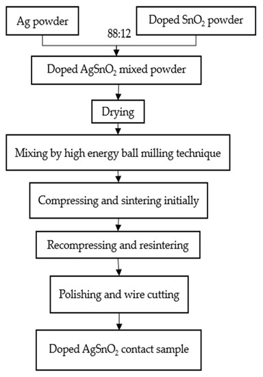 The Cr-doped AgSnO2 contact materials were prepared using the high-energy ball milling and powder metallurgy method. This process is shown in Figure 3. The Ag powders and Cr-doped SnO2 powders were weighed at a mass ratio of 88:12 and then mixed using the high energy ball milling technique (2 h). The agate balls used for grinding contained twenty balls Φ 10−2 m and 10 balls Φ 2 × 10−2 m. The ball to powder weight ratio was 15:1. The rounding speed of the ball mill was set as 500 r/min. The mixed powders were compressed into cylindrical samples with a diameter of 20 mm by 769YP-60E powder tablet press machine (Keqi New Technology Co., Ltd, Tianjin, China). The initial pressure was set at 107 Pa (17.6 tf) with 10 min kept. Then, the samples were put into the box-type electric furnace (SIOMM, Shanghai, China) for initial sintering (500 °C, 90 min). In order to enhance compactness, the samples were recompressed (2 × 107 Pa, 10 min) and re-sintered (700 °C, 60 min) to avoid cracks [23]. Finally, the samples were polished and wire cut to smooth the surface. The AgSnO2 contact material with a diameter of 3.2 × 10−3 m and a thickness of 3.5 × 10−3 m was obtained. The instruments and equipment required for the above experiments are shown in Table 2.