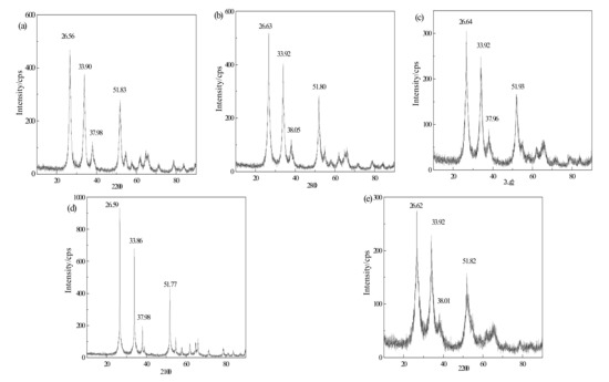 Figure 4 shows the X-ray diffraction patterns of intrinsic SnO2 and doped SnO2 powders, in which the peak positions of the characteristic diffraction peaks are marked. The four representative characteristic diffraction peaks marked in the figures represent the [211], [200], [101] and [110] crystal planes of SnO2 from right to left.