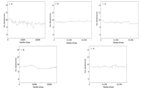 Arc duration of Sn1−xCrxO2 contact material. (a) x = 0; (b) x = 0.083; (c) x = 0.125; (d) x = 0.167; (e) x = 0.25.