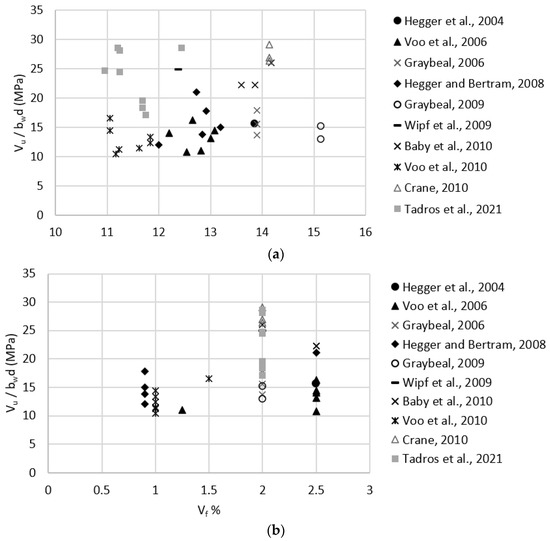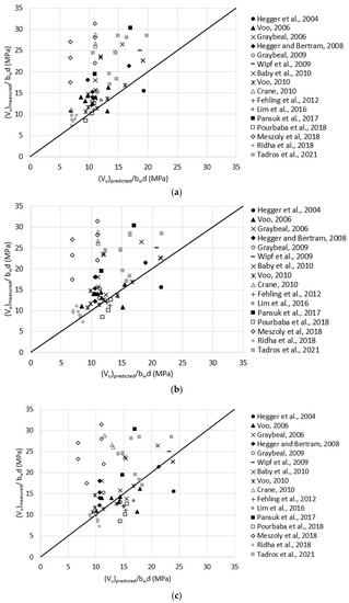 - For UHPC beams with a fiber volume fraction of at least 2%, the level of prestressing () and longitudinal reinforcement ratio () were found to have a significant effect on the shear strength of prestressed and non-prestressed beams, respectively.