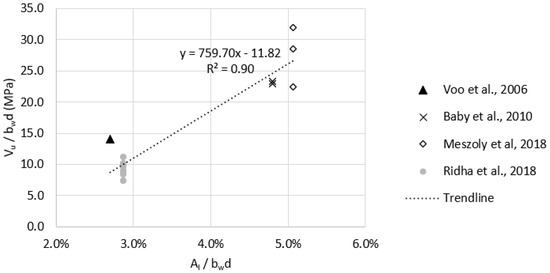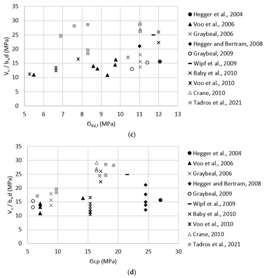 - Among the parameters affecting the shear strength of prestressed and non-prestressed beams, the tensile strength of UHPC () was found to have a significant positive correlation with the shear strength of UHPC beams.