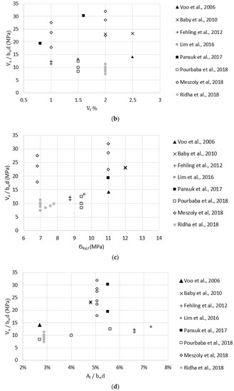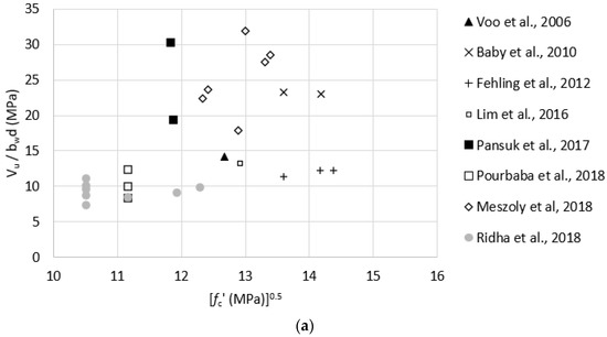 | Reference | Specimen ID | Specimen Shape | bw (mm) | d (mm) | h (mm) | % | a/d | (MPa) | lf (mm) | Φf (mm) | (MPa) | Vu (kN) | (MPa) | ||