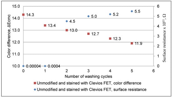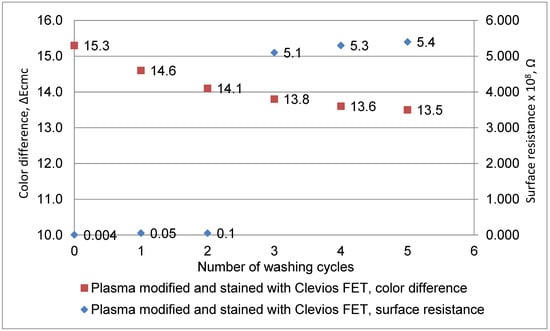 | Plasma-modified and dyed with Clevios F ET, after 5 washing cycles | 52.65 ± 0.07 | −2.97 ± 0.07 | 1.66 ± 0.07 | 3.4 ± 0.07 | 150.85 ± 0.07 | 21.31 ± 0.07 |