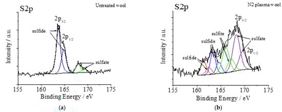 - Kan, C.W.; Chan, K.; Yuen, C.W.M. Surface characterization of low temperature plasma treated wool fiber. Fibers Polym. 2004, 5, 52–58. [Google Scholar] [CrossRef]