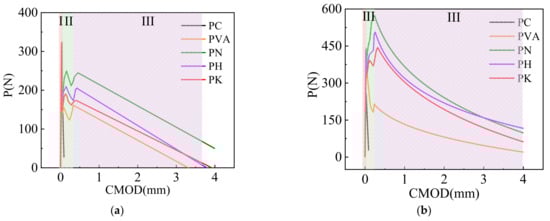 From Figure 4a–c, it can be seen that the load-crack opening width (P-CMOD) curves in the specimens mainly occur in three stages. The first stage is the elastic stage from the beginning of loading to the onset of cracks, during which fiber modification does not significantly affect the specimen behavior. This stage mainly depends on the properties of the cement matrix. The second stage is the non-linear propagation stage of the cracks. Compared with PC, the addition of certain number of fibers is able to effectively suppress the formation of original defects (i.e., interfaces and voids) as well as the propagation of microcracks in the specimens. When the modified fiber contents are 0.5% and 1%, the bridging effect of fibers is activated. The load increases to its peak (i.e., post-cracking load), and the P-CMOD curve shows an obvious strain-hardening response. The modified fibers improve due to the good interfacial effect of the modified fibers, which make it possible to transfer the load better, as a good interfacial effect exists and crack propagation is inhibited. When the specimens evolve to the residual stage, the load sharply decreases with the growth in the crack opening width. The load in modified fiber specimens decreases more slowly, perhaps because the fiber surface modification improves the microstructure of the matrix and increases the interfacial compactness. This may limit the increase in the crack width and lead to a slower decreasing curve.