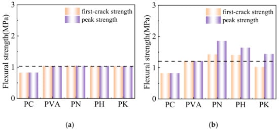 It can be seen from Figure 5 that the initial cracking strength and peak strength of the modified fiber are approximately improved in comparison with unmodified fibers. When the fiber content is 0.25%, the modified fibers hardly affect the strength of the cemented soils. The initial crack strength is equal to the peak strength, because the fiber content is lower and the bridging effect of fibers is not fully triggered. When the fiber content approaches 0.5% and 1%, the bending strength of the modified fiber shows a second peak (which is higher than the first peak). When the fiber content is 1%, the peak strength of PN1, PH1 and PK1 increases by 73.3%, 61.7% and 49.9%, respectively, when compared with PVA1, which may result from the increased possibility of fiber distributing in the horizontal direction of the cracks. Moreover, the interface bonding effect between the modified fiber and the matrix is improved, which leads to better stress redistribution and transfer, and thus the fracture resistance is increased. The strength reduction is less pronounced and exceeds the initial crack strength. It can be seen that the rate of load drop and the strength recovery of the specimens are highly dependent on the orientations of fibers, as well as the amount of fibers in the cemented soil, which are bonded with the matrix.