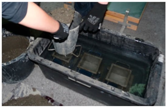 The UWC mixes were prepared in the laboratory mixer with 30 L. The concrete specimens were prepared in cubic steel molds 100 × 100 × 100 mm. The molds were first placed at the bottom of the container, which was then filled with water until the water level was 20 cm above the upper edge of the mold. Then, the concrete mix was cast directly from above the water table without smoothing the formed surface of the concrete (Figure 2). The specimens were demolded after two days and then stored in the water containers at 18–20 °C until compressive strength testing. Immediately before the test, the specimen’s top surface was levelled using a concrete saw. The compressive strength was determined after 28 and 56 days of specimen curing.