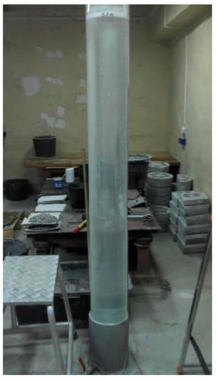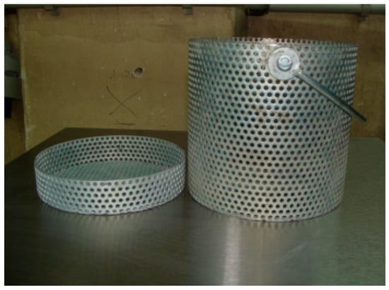 The method for determining wash-out loss for the concrete mix has been developed in Belgium. The method has been standardized in the USA and described in the instruction CRD-C61-89A [36]. The procedure consists of immersing the concrete mix sample, placed in the perforated container, in the cylindrical plastic pipe filled with water. Then, the loss of mass of the concrete mix is determined. The concrete mix container is cylindrical with a diameter of 130 ± 2 mm and a height of 120 ± 2 mm. It consists of a perforated steel plate with a thickness of 1.4 mm (Figure 3). The transparent pipe in which the test is performed has a height of 2000 ± 2 mm and an internal diameter of 190 ± 2 mm (Figure 4).