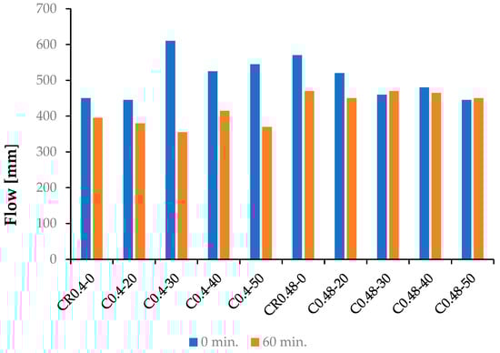 The effect of the binder content on the tested concrete mixes’ consistency was visible. The UWC mixes with the binder content of 400 kg/m3 and w/b = 0.48 had the consistency of SCC mix or close to it. All concrete mixes from the C0.48 series obtained flow diameters above 400 mm after 0 and 60 min. Such a flow is recommended for UWC mixes in the German Standard DIN 1045-2 [35]. However, no recommendations regarding the time of consistency testing are given in this standard. For the concrete mixes from the C0.4 series, with a high binder content of 530 kg/m3, the flow diameter above 400 mm was noted after mixing the components of the concrete mix CR0.4-0 without fly ash addition. Despite using a large amount of superplasticizer SP, the strong influence of FBCFA content on consistency of the tested UWC mixes was observed. This effect was particularly significant when the FBCFA content exceeded 30% of the cement mass. The used volume of SP was very high in these concrete mixes, exceeding even 3% of the binder mass, and significantly affected the UWC mixes’ production cost. Only slight changes in the consistency with time were observed in the case of the UWC mixes with w/b = 0.48. The reason for this could be the properly adjusted SP content in this series of concrete mixes. In the case of the mixes with w/b = 0.4, when the content of FBCFA increased, the rise of water demand led to a significant worsening of workability and consistency despite the high amount of SP admixture. The results of consistency testing are presented in Table 4.