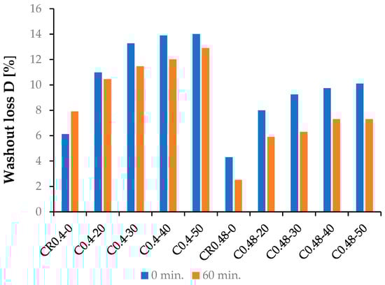 The results of UWC mixes’ wash-out loss testing according to CRD-C61-89A [36] are presented in Figure 6. The wash-out loss D was determined after 0 and 60 min of mixing components. The content of AWA was constant and equal to 1% of the binder mass in all concrete mixes. The determined wash-out losses for the individual UWC mixes are presented in Table 4.