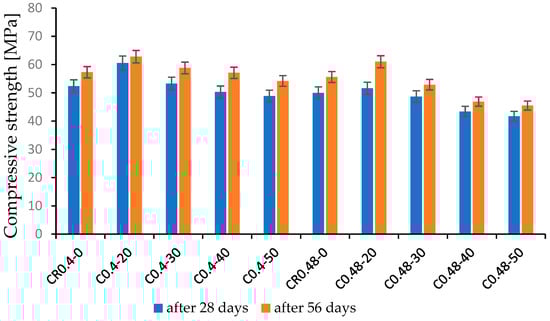 The UWC compressive strength testing results after 28 and 56 days of curing are presented in Table 5 and Figure 7. A slight increase in compressive strength was observed for the concrete with w/b = 0.40 and FBCFA content 20% and 30% compared to concrete CR0.4-0 (without FBCFA); it was 3.2% and 1.7%, respectively, after 28 days, and 9.5% and 2.6 %, respectively, after 56 days. A decrease in compressive strength has been noted for concrete C0.4-40 and C0.4-50; it was 6.7% and 8.6%, respectively, after 28 days, and 0.4% and 5.4%, respectively, after 56 days. Slightly diminishing strength for concrete with w/b = 0.48 has been observed at 30% content of FBCFA, while maximum falls were noted at 50% content of FBCFA and were equal to 16.8% and 18.2% after 28 and 56 days of curing, respectively. The found rise of compressive strength for UWC containing up to 20% of FBCFA was a result of sealing the tested concrete’s microstructure. As presented in [13,41,42], an addition of fly ash caused growth of the volume of crystalline ettringite inside the cement matrix, leading to an increase in the compressive strength of concrete. When FBCFA content exceeded 30%, UWC compressive strength decreased. The diminishing was milder with concrete ageing. The rate of strength changed depending on the binder content in the concrete mix.