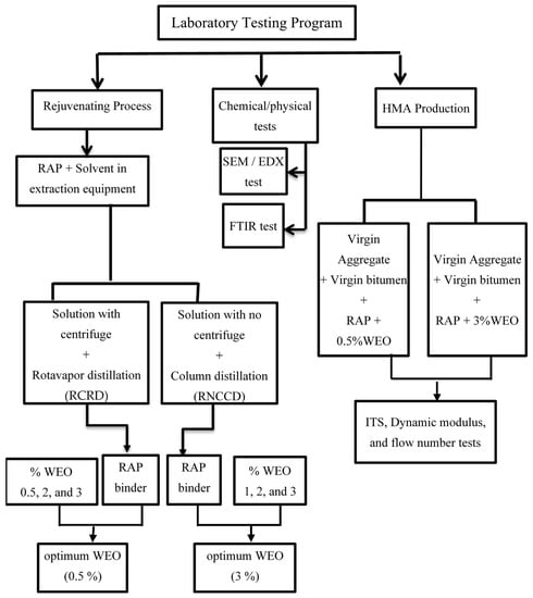 The experimental work was separated into four main tasks in order to achieve the objectives of this research. The first one was bitumen extraction from RAP, followed by a recovery process, which was based mostly on concentrating the bitumen solution (bitumen and solvent) by distillation. The second task included the characterization of the RAP binder and the virgin binder through traditional bitumen tests and determining the optimal percentage of the selected rejuvenator. The third task was the design of a conventional asphalt mix with high RAP content using the Marshall mix design method, and the last task involved laboratory testing to assess the rejuvenated mixtures’ performance in comparison with the control mix. It is worth noting that Egypt and many countries in the Middle East still use the conventional Marshall mix design method along with the penetration grading system for binder characterization [44]. Figure 1 outlines the experimental testing program.