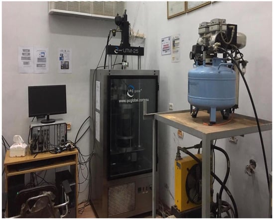 The dynamic modulus (E*) of the asphalt mix is the response produced under a continuous sinusoidal loading condition. The complex dynamic modulus is the stress/strain ratio of linearly viscoelastic samples with continuous sinusoidal load in the frequency range [53]. The stiffness of the investigated mixes was evaluated through dynamic modulus testing. A UTM-25 universal testing machine, IPC Global, Boronia, Australia, was used for the test. Figure 3 and Figure 4 display the universal testing machine (UTM-25) used for dynamic modulus/flow number testing and the samples used for the E* test after cutting and coring, respectively.