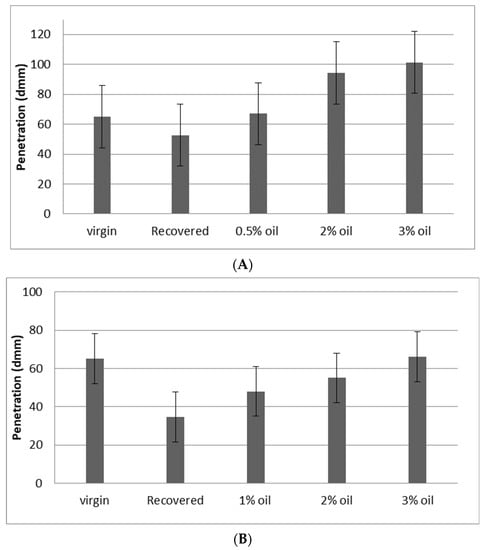 Penetration of virgin, recovered, and rejuvenated bitumen with WEO contents. (A) RCRD recovered aged binder; (B) RNCCD recovered aged binder.