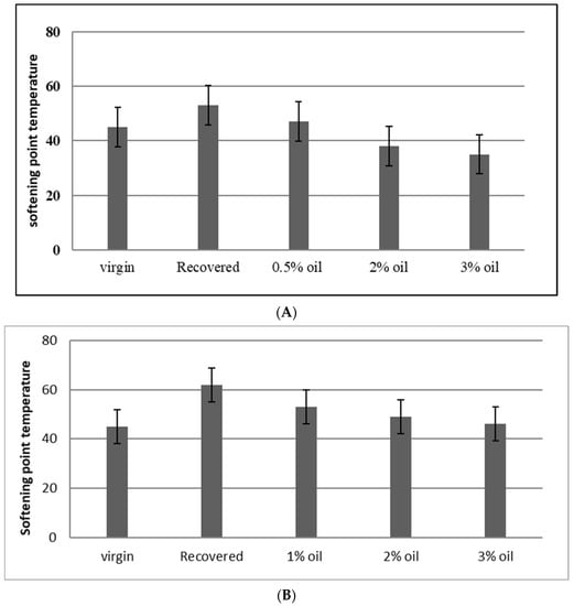 Softening point temperatures for virgin, recovered, and rejuvenated bitumen with WEO contents. (A) RCRD recovered aged binder; (B) RNCCD recovered aged binder.