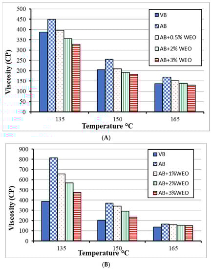 Brookfield viscosity of virgin, recovered, rejuvenated bitumen by WEO contents. (A) RCRD recovered aged binder; (B) RNCCD recovered aged binder.