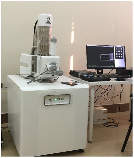 The properties of the aged and rejuvenated aged bitumen were examined by scanning electronic microscopy (SEM). Furthermore, quantitative chemical analysis was performed by using a JSM-IT 100, JEOL SEM technologies, Akishima, Japan energy-dispersive X-ray (EDX) spectroscope. Figure 8 shows the SEM/EDX equipment.