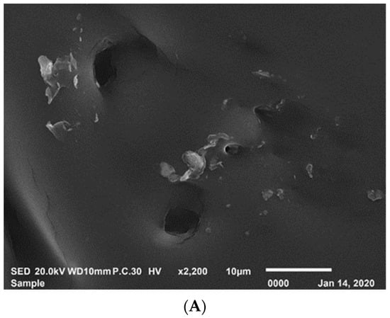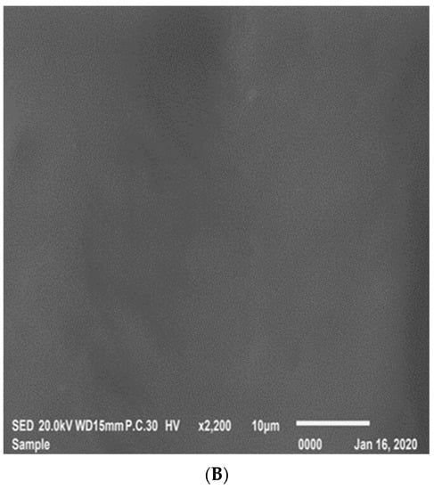 On the morphological surface of aged bitumen, Figure 9A reveals some unformed fragments with scattered bores that make the surface rough and uneven. The bores and unformed fragments were totally obliterated by the WEO rejuvenator. The main mineral components of the aged bitumen were C (90.49%) and O (7.71%), with a small amount of S (1.32%). The addition of WEO to the recovered binder resulted in an increase in the percent of carbon (C) and aluminum (Al). The increase in the percentage of carbon can be explained by the fact that the main component of motor oil is carbon, which ranges from 73–80% [54]. The presence of aluminum motor body remnants could result in an increase in the percentage of Al [32].
