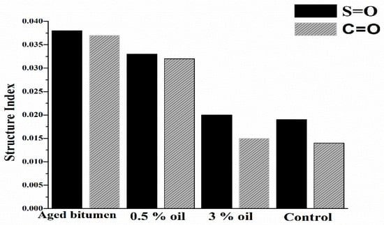 Lamontagne proposed a numerical method to quantify the structural indices of carbonyl (IC=O) and sulfoxide (IS=O) compounds, as indicated by Equations (1) and (2) [55,56,57]. It can be said that as the structural indices of sulfoxide or carbonyl compounds decrease, the efficiency of the rejuvenating process improves.