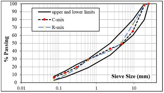All mixes were designed according to the classical Marshall mix design method. For the control and recycled mixes, the aggregates were blended together to achieve the Egyptian specifications for the 4-C wearing surface course [43]. Figure 12 depicts the final gradation, along with the specification limits of the 4-C wearing course for both mixes. The proportions of aggregates 1 and 2 in the control mix were 19 and 32 percent, respectively, whereas the proportions of fine aggregate and mineral filler were 43.5 and 5.5 percent, respectively, by total weight of the mix. As for the recycled mix (R-mix0), the RAP content was 50%, whereas aggregate 1, aggregate 2, fine aggregate, and mineral filler had percentages of 10%, 10%, 25%, and 5%, respectively. It is worth mentioning that the gradations are within the specification limits, and the two gradations were preserved as much as possible, as indicated in Figure 12.
