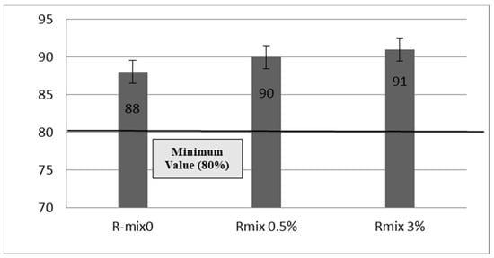 The ability of asphalt pavement to withstand moisture is referred to as moisture susceptibility. Moisture penetrated the asphalt mixtures. An indirect tensile strength (ITS) test was carried out to determine the moisture damage resistance. Figure 13 shows the tensile strength ratio (TSR) values for various mixtures, which illustrate the water sensitivity. As the TSR increases, the resistance to moisture damage is improved. It is noted that the rejuvenated RAP mixtures show a substantial improvement compared to the recycled mixture. The TSR values for all mixtures achieved the specifications of the Egyptian Code of Practice, which is 80% min [43].