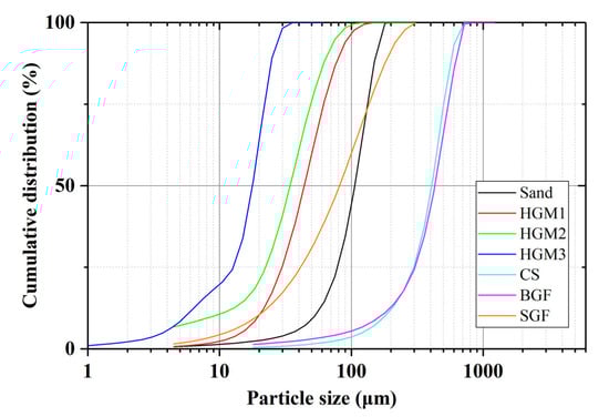 Figure 1. Particle size distribution of HGMs, CS, GFs, and sand.