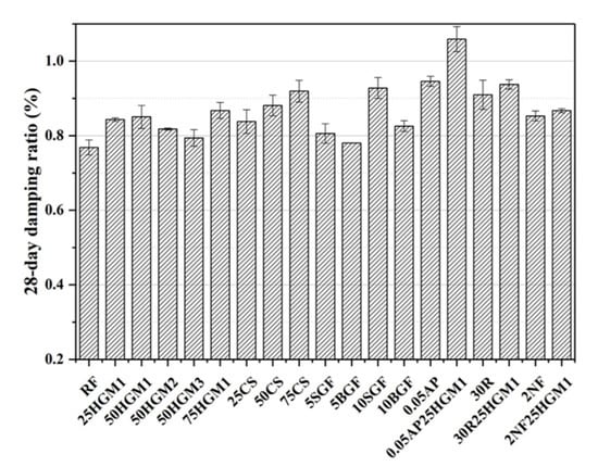 For investigating the possible materials that have a combination effect with HGM1 on the damping ratio, AP, RP, and NF were added separately with HGM1. It can be found that when adding HGM1 with RP or NF in mortar, the damping ratio is slightly higher than the specimen that only contained RP or NF. However, the damping ratio of the specimen that contains both AP and HGM1 increases to 1.06%, which was 38.02% and 11.95% higher than the RF specimen, and the specimen only contained AP, respectively. Therefore, only the AP had a combination effect with HGM1 on the damping ratio because both AP and HGM increased the voids of specimens, but the compressive strength of 0.05AP25HGM1 drastically decreased compared to the RF specimen. This will be discussed in Section 3.2. Therefore, it is difficult to increase the damping ratio with HGM and another damping-improving material without decreasing or slightly decreasing compressive strength.