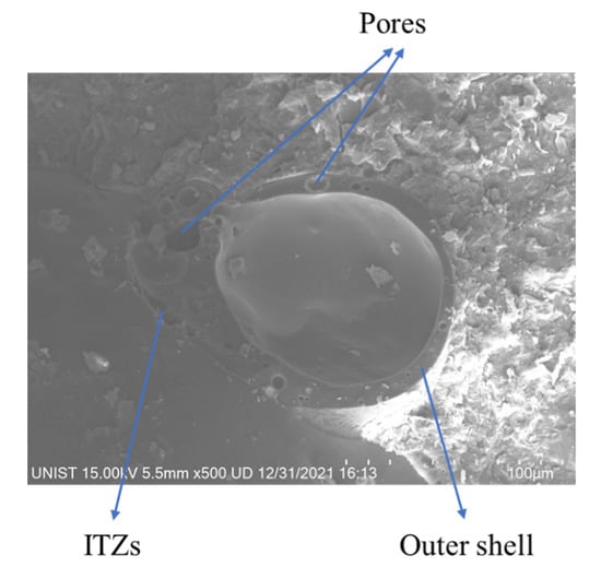 On the other hand, CS also decreased the compressive strength, and the CS with a replacement ratio of 25% and 50% only decreased the compressive strength by 3.52% and 13.20%, respectively, compared to the RF specimen. Moreover, the compressive strength drastically decreased by 40.52% at 75% replacement ratio of CS. However, the 50CS and 75CS specimens had higher compressive strength than HGM1 specimens with the same replacement ratio due to the higher crushing strength of CS than that of HGM1, as shown in Table 2. The decrease in compressive strength is due to the large volume fraction of CS that causes many weak interfacial transition zone (ITZs) [43] between the CS particle and mortar matrix due to the pores in the outer shell of CS particle [44], as shown in Figure 4, which led to the drop in compressive strength.