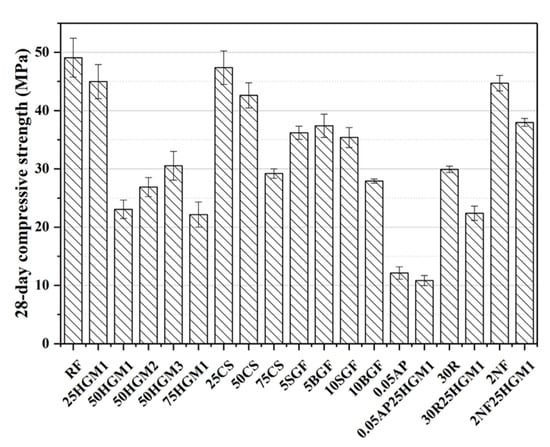The combination of HGM1 and RP, AP, or NF decreased compressive strength compared to the RF specimen. Especially, the compressive strength of (0.05AP and 0.05AP25HGM1) decreased by 75.29% and 77.91% after 28 days of curing, respectively. This is because AP significantly increased the porosity of specimens. Besides, the specimens containing AP, RP, or NF with HGM1 also had lower strength than the specimen containing only AP, RP, or NF, respectively. This is caused by the extremely low crushing strength of HGM1, as shown in Table 2.