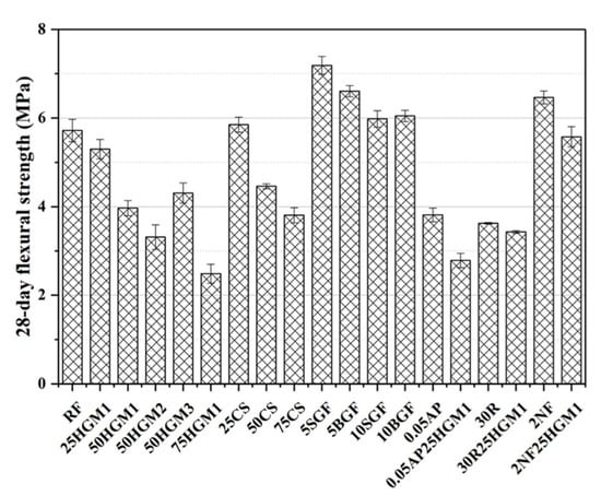 Moreover, the flexural strength of specimens that contain AP or RP are about 33% lower than the RF specimen, whereas the 2F25HGM1 specimen slightly decreased the flexural strength by 2.45% due to the low strength of HGM1. However, the fiber-reinforced specimens provide comparable flexural strength; the 2NF specimen increased the flexural strength by 13.11%. Besides, all specimens with GF increased the flexural strength by 25.70% (5SGF), 15.56% (5BGF), 4.55% (10SGF), and 5.77% (10BGF), respectively, because GF played a role as reinforcement in mortar, similar functions as in particulate composites [46], and the reinforcement effect of GF in flexural strength was dominant. In other words, the addition of GF can enhance the deformation resistance of concrete; thus, the flexural strength can be improved. Furthermore, the flexural strength decreased with the increase of GF content due to the lubricant effects of more GF particles [27], and this is because GF is also used as a kind of solid lubricant [47], so a low dosage of GF is promising to improve the flexural strength of mortar while improving damping ratio.