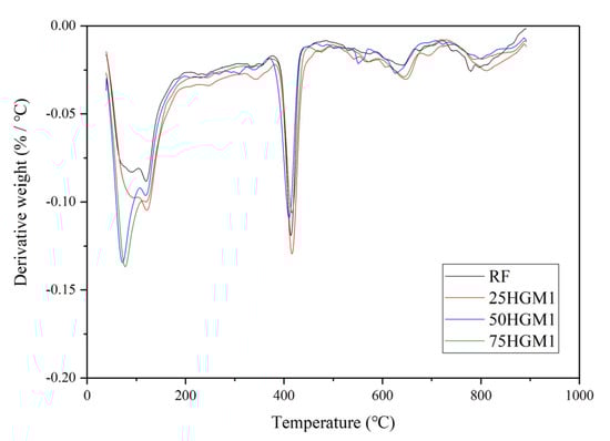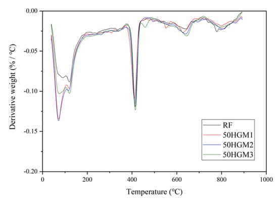Figure 11. TGA results for specimens at a 50% replacement ratio with different HGMs.