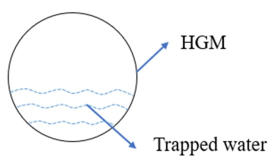 Figure 8 shows the TGA results of specimens with HGM1 at different replacement ratios. The weight loss in TGA was normalized by cement weight because the mass ratio of cement was different for each specimen due to the various densities of HGMs based on sand volume replacement. For HGM specimens, the first peak between 60 °C and 105 °C is related to the evaporation of bound water. It can be found that the remained water content increased with the increase in the replacement ratio of HGM1. Figure 9 shows the possible way that water is trapped in the hollow structure because of microcracks on the HGM particle surface, as shown in Figure 10. When the replacement ratio of HGM1 increased, the water penetrated into the hollow structure through the microcracks after 28 days of curing. The second peaks between 120 °C and 150 °C and the third peaks between 400 °C and 500 °C of the three HGM1 specimens are very close to the RF specimen, which means HGM1 did not participate in hydration and pozzolanic reaction. This was also corresponding to the compressive strength results. Moreover, the energy dissipation was affected when the trapped water increased. Although the damping ratio increased with the increase in the replacement percentage of HGM1, the increment was only 3.21% between 75HGM1 and 25HGM1 because the trapped water filled in the hollow structures. It eliminated the effect of HGM1 particles on the damping ratio because vibration transmission speed is higher in water than in air.