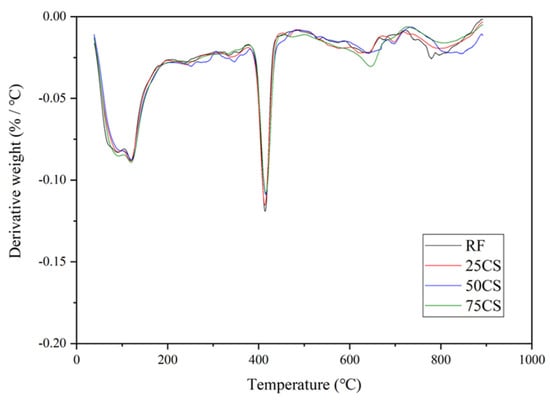 However, the TGA results of CS specimens did not have the same trend as HGM1 specimens. The first peak values of CS specimens were almost the same as the RF specimen when increasing the replacement ratio of CS, which means that there was no water trapped in the CS particle increased when CS content increased, as shown in Figure 12. Besides, compared to the HGM1 specimens, the first peak was lower at the same replacement ratio because there was no trapped water in the CS specimens due to the outer shell of the CS particle, which blocked the water from penetrating into the hollow structure. Therefore, at the replacement ratio of CS reached 75%, the increment of damping ratio was 9.80% compared to 25CS, which was three times that of HGM1 specimens. Besides, the second and third peaks of CS specimens were almost the same as the RF specimen, which indicated CS did not participate in hydration and pozzolanic reaction, so the compressive strength declined while increasing the CS content.