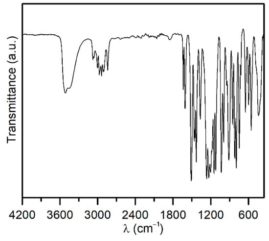 Figure 2 presents the FTIR curve for eugenol with characteristic peaks: in the range of 720–1250 cm−1 attributed to the vC=C bond, the sharp peaks visible at 1600 and 1500 cm−1 correspond to the stretching of C=C of the aromatic group, peaks at a wavelength in the range 2700–2900 cm−1 can be assigned from CH3 groups and peak at 3500 cm−1 comes from hydroxyl groups [57,58].