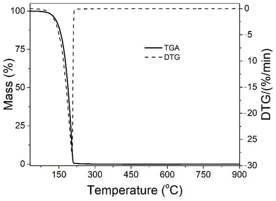 The TGA and DTG curve of eugenol is presented in Figure 3. The temperature at which the weight loss was 5% and 10% was observed at 134 °C (T5%) and 147 °C (T10%), respectively, and can be attributed to the vaporization of eugenol. One sharp peak at 205 °C was observed on the DTG curve, indicating the degradation of eugenol with a maximum degradation rate of 27.4%/min. Eugenol is an organic substance; therefore, no residual mass was detected.