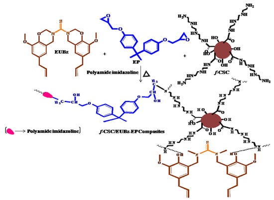 Vaithilingam et al. described the method of obtaining the eugenol–benzoxazine monomer (EBUz) based on thiourea and its use in the production of epoxy composites with amine functional carbon from cashew nut shells (f-CSC) [64]. Eugenol was mixed with paraformaldehyde and refluxed at 80 °C for 1 h. Next, thiourea was introduced to composition, and the reaction was conducted at 100 °C for 12 h to obtain EBUz. The scheme of preparation of these composites is shown in Figure 4. For a composition containing a 1:1 ratio of EUBz and diglycidyl ether of bisphenol-A (EP), and the calculated amount of the polyamide–imidazoline hardener was introduced to f-CSC, then the mixture was poured onto a glass plate and hardened (according to the schedule 40 °C, 60 °C, 80 °C, 100 °C, 120 °C, 160 °C and 180 °C for 1 h at each temperature) to obtain thin films. The produced composites based on thiourea-based eugenol-EUBz monomer and epoxy resin (EP) containing 1, 3, and 5 wt.% f-CSC were characterized by improved thermal stability, greater char yield, and higher Tg values. The authors showed that the glass transition temperature, the initial degradation temperature, and the char yield were the highest for the samples with the highest filler content and were, respectively, 202.9 °C, 332.8 °C, and 45.28%. In addition, composites indicated good hydrophobic and anti-corrosion futures. The authors showed by testing the contact angle that the increase in f-CSC content in polybenzoxazine EP composites (for which there was an increase in contact angle values from 95.1 to 110.8) contributes to the improvement of water and moisture resistance properties and makes it possible to use these materials as anti-corrosion coatings.