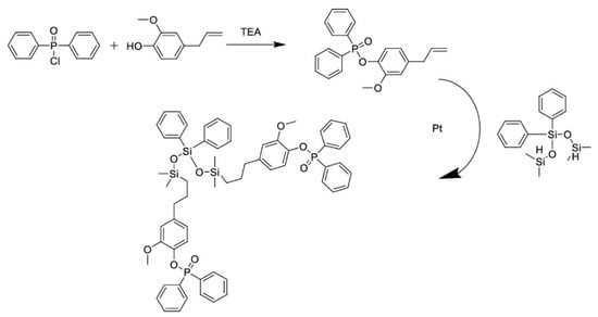 Due to the flammability of the epoxy resin and a large amount of smoke emitted, the development of a bio-based flame retardant is the subject of many scientific papers. Reactive phosphate flame retardant derived from isoeugenol was developed by Pourchet et al. [68]. Environmentally friendly flame retardant such as diepoxy-isoeugenol phenyl phosphate (DEpiEPP) was prepared. This unique compound combines both the bio origin isoeugenol (iEu) catalytically extracted from the lignin and a phosphate group, providing flame retardancy. DEpiEPP was synthesized in two steps: condensation of iEu and phenyldichlorophosphate (PPDC) in toluene with triethylamine (TEA) as acid acceptor and epoxidation by oxone. Then, it was introduced into diglycidyl ether of bisphenol A resin (DGEBA) and into the bio-glycidyl ether of epoxyisougenol (GEEpiE) and cured with camphor anhydride (CA) for 2 h at 150 °C. Thermal analysis proved that DEpiEPP is a good flame retardant and provokes a significant charring of both epoxy thermosets (DGEBA-DEpiEPP and GEEpiE-DEpiEPP). In the case of DGEBA/CA and GEEpiE/CA materials, along with the increase in phosphorus content in the flame retardant, the amount of char content also increased. The glass transition temperature determined via DSC analysis of the cured composites decreased with increases in the amount of DEpiEPP monomer from 155 °C to 71 °C in the DGEBA matrix and from 162 °C to 71 °C in GEEpiE. Importantly, for all tested composites, no additional exothermic peak was observed on the DSC curves after the hardening process, which proves that the cross-linking reaction was completed. Analysis of the mechanical properties showed that the DGEBA-CA-DEpiEPP epoxy polymer exhibits ductile behavior with a yield point of about 85 MPa and 2% strain, followed by highly nonlinear behavior suitable for plasticity. While the GEEpiE -CA-DEpiEPP epoxy system exhibits elastic–brittle properties with sudden failure after exceeding the yield point. The Tg value of the composites containing 2% phosphorus was 105 °C for the DGEBA matrix and 129 °C for the GEEpiE matrix, and the modulus of elasticity was 5.1 and 4.8 GPa, respectively. Such features are suitable for the production of composites with favorable thermomechanical properties. Additionally, Yu et al. developed a eugenol-based flame retardant containing phosphorus (P) and silicon (Si) (EGN-Si/P) groups for bisphenol A epoxy resin [69]. The synthesis scheme of EGN-Si/P is shown in Figure 5. Flame retardancy was obtained by a two-step reaction from eugenol. First, EGN-P was synthesized by the Williamson etherification reaction from a solution of eugenol and triethylamine in tetrahydrofuran i diphenylphosphinyl chloride. Then, the platinum catalyst was dissolved in methylbenzene and heated then silane was added.