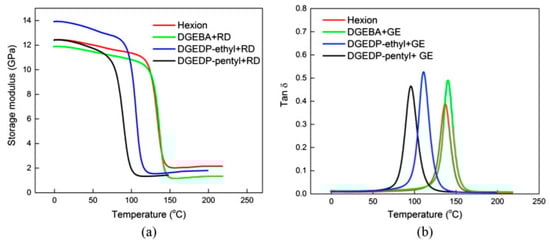 (a) Storage modulus and (b) Tan (δ) as a function of temperature for Hexion, DGEBA/15 wt% GE, and DGEDP/15 wt% GE epoxy/glass fiber composites. (Reprinted with permission from Compos. Part A Appl. Sci. Manuf. 2017, 100, 269–274 Copyright 2017 Elsevier) [70].