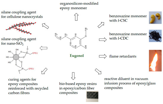 Environmentally friendly composites include polymers and fillers that are either biodegradable or of biological origin. Biocomposites can be grouped according to composites made of renewable raw materials; composites, the waste of which can be composted or recycled; and composites whose production process is sustainable [76]. It is most preferred that all components of the composite material are derived from renewable sources. Therefore, research into the use of eugenol as a bio component of epoxy resin composites for industrial applications is very important. Articles describing epoxy composites in which eugenol was used to modify the polymer matrix or filler and as a modifier or hardener were selected for the review.
