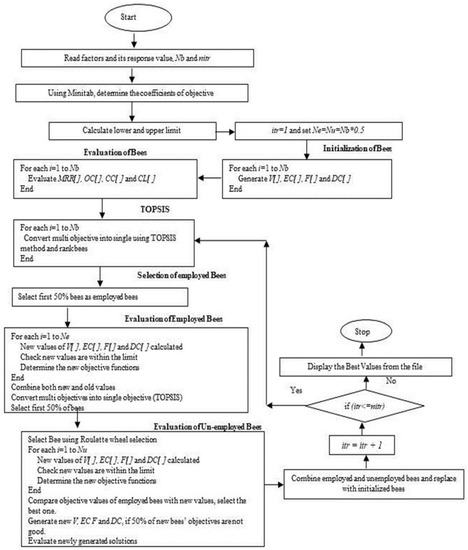 The implementation flow diagram for obtaining the optimum response values is presented in Figure 1, and the step-by-step procedure is demonstrated [35,36] in Appendix A. Table 7 represents the list of ABC parameters and their value considered in this work.