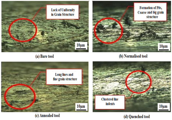 Steps’ effect of heat treatment on tool electrode. (a) Bare tool; (b) Normalized tool; (c) Annealed tool; (d) Quenched tool.