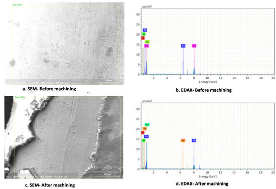 SEM and EDAX analysis of tool electrode before and after drilling process. (a) SEM-Before machining; (b) EDAX-Before machining; (c) SEM-After machining; (d) EDAX-After machining.