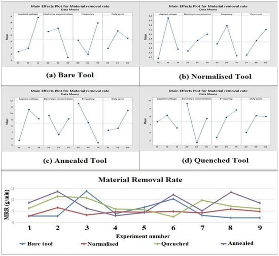 Main effect plots and comparison plot of MRR for tool electrodes. (a) Bare tool; (b) Normalized tool; (c) Annealed tool; (d) Quenched tool.