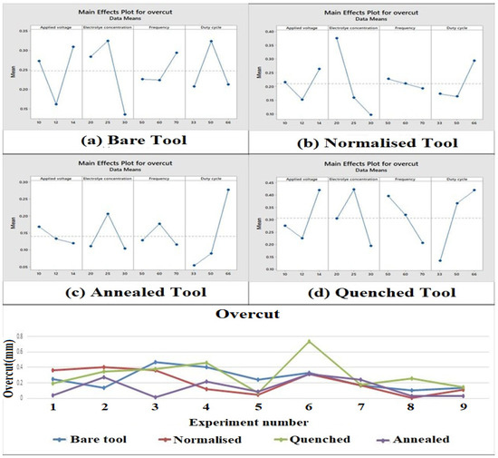 Main effect plots and comparison plot of overcut for tool electrodes. (a) Bare tool; (b) Normalized tool; (c) Annealed tool; (d) Quenched tool.