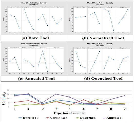 The electrolyte concentration was observed to be the most influential parameter for the bare and quenched tool electrodes as shown in Figure 6. When the electrolyte concentration is less, the ionization rate reduces due to the large grain size of the material which in turn leads to an increase in conicity. For the normalized and annealed tools, the frequency was observed to be the most influential parameter. It is evident from the main effect plot that conicity increases with an increase in frequency which implies a decrease in pulse duration. It is noted that the duty cycle ratio is also high when the frequency is high. This shows that the larger pulse could, in time, lead to a higher conicity [45]. It can be seen that the quenched tool had a better conicity due to rapid cooling which leads to a more uniform structure, thus improving its conicity of the machined through hole. The quenched tool electrode had 36.38% better conicity than the untreated tool electrode.