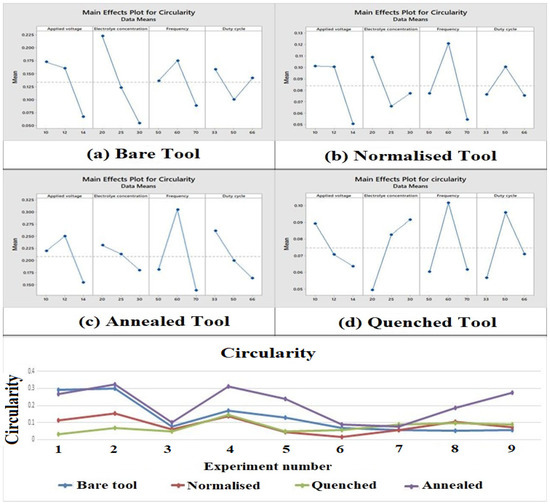 Main effect plots and comparison plot of circularity for tool electrodes. (a) Bare tool; (b) Normalized tool; (c) Annealed tool; (d) Quenched tool.