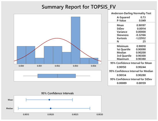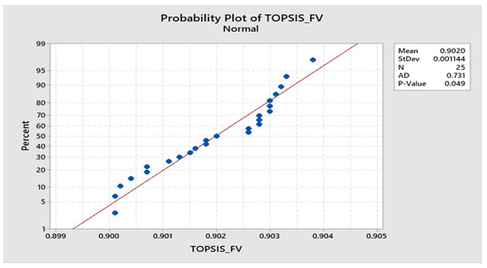 The program executed 25 runs and the statistical analysis of the results is shown in Figure 8. It is confirmed by the p-Value of 0.049 that the fitness values obtained by 25 runs were in the normal distribution range; hence, the optimum parameters obtained by ABC algorithms are acceptable. The normality test of 25 runs is represented in Figure 9 which also supports the acceptability of the ABC algorithm’s results and the model proposed is adequate to demonstrate the relationship between various inputs to response values.