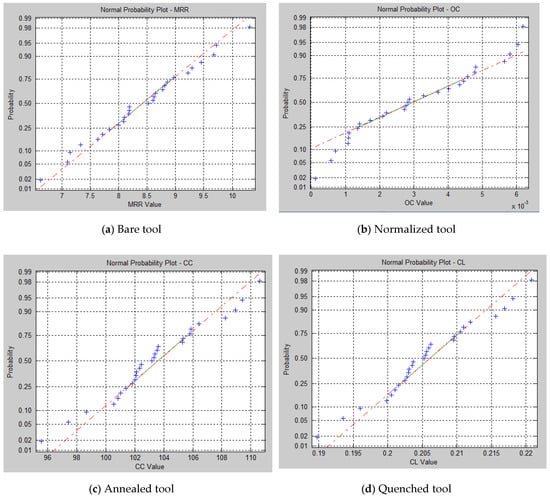 Normal probability plot for response values. (a) Bare tool; (b) Normalized tool; (c) Annealed tool; (d) Quenched tool.