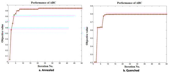Figure 10 represents the normal probability plot drawn for the output of response values obtained by implementing the ABC algorithm. Figure 11 shows the convergence plot of the ABC algorithm. It shows that quick convergence of the algorithm was obtained in both the annealed and the quenched tool electrode. The optimum values of V, EC, F, and DC for the maximum value of the MRR and the minimum values of OC, CC, and CL are shown in Table 12.