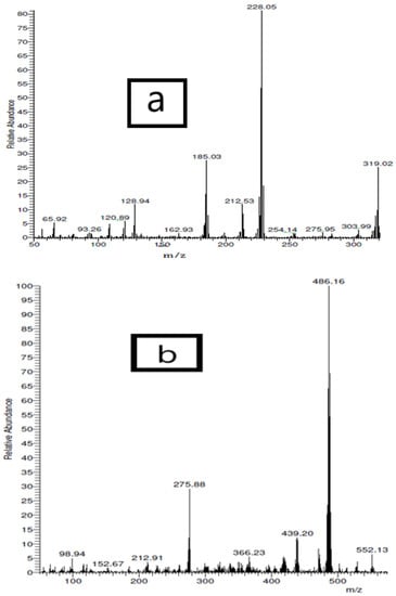 The mass spectra of the free ligand and its Co(II) complex are represented in Figure 1. The spectrum of the free ligand showed m/z peak at 319.02 amu with a relative intensity of 25%, which corresponds to the (C18H17NOFe) molecule. By matching molecular formula weight of 319.06 amu, which was in best accordance with this molecule, the predicted molecular formula of the investigated acetylferrocene azomethine ligand was confirmed. While the spectrum of [Co(HL)(H2O)4]Cl2·2H2O complex showed molecular ion peak at 552.13 amu which is highly agreed upon, the expected molecular weight (554 g/mol) that confirms this chelate formation.